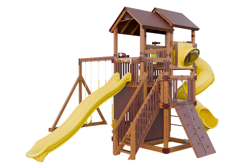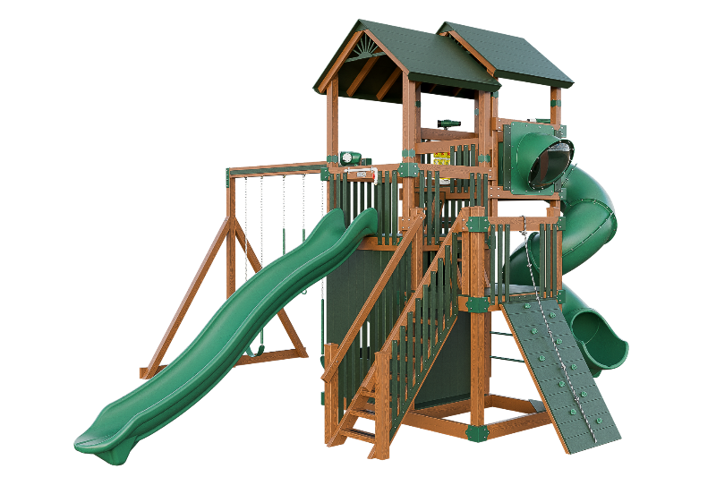 This playset is a wonderful choice for children who love to explore and have fun. It features three levels of play space and a clubhouse underneath, where kids can enjoy their own private space. The top level gives them a panoramic view of their surroundings, while the lower levels offer different activities and challenges. Whether they want to pretend they are kings and queens, pirates and adventurers, or anything else they can imagine, this playset will stimulate their creativity and keep them entertained for hours. This playset is also great for physical development, as it encourages children to climb, balance, and move around. This playset is a valuable investment for any family that wants to provide children with a safe and engaging outdoor play environment.